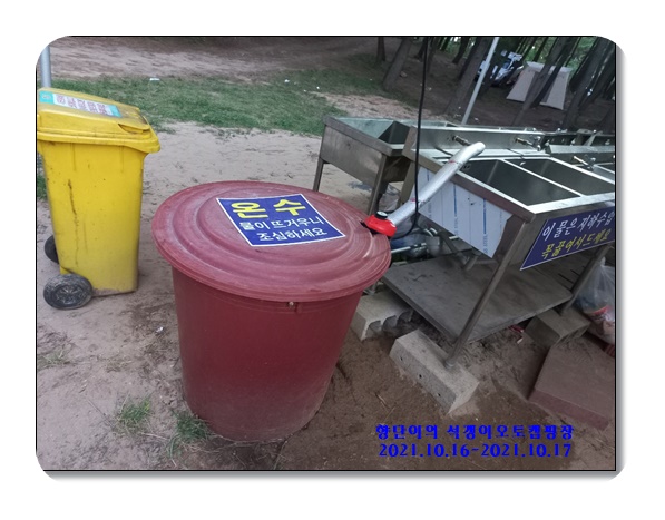 온수는 바가지로 떠서 쓸 수 있으며 물이 뜨거우니 조심하라고 쓰여 있다.