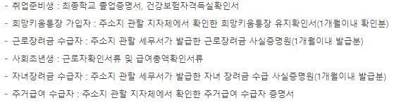 - 소득확인서류:소득금액 증명원, 연금수급권자 확인서, 무소득자는 신고사실 없음 사실증명원, 그 외는 주택도시 기금 홈페이지 참조