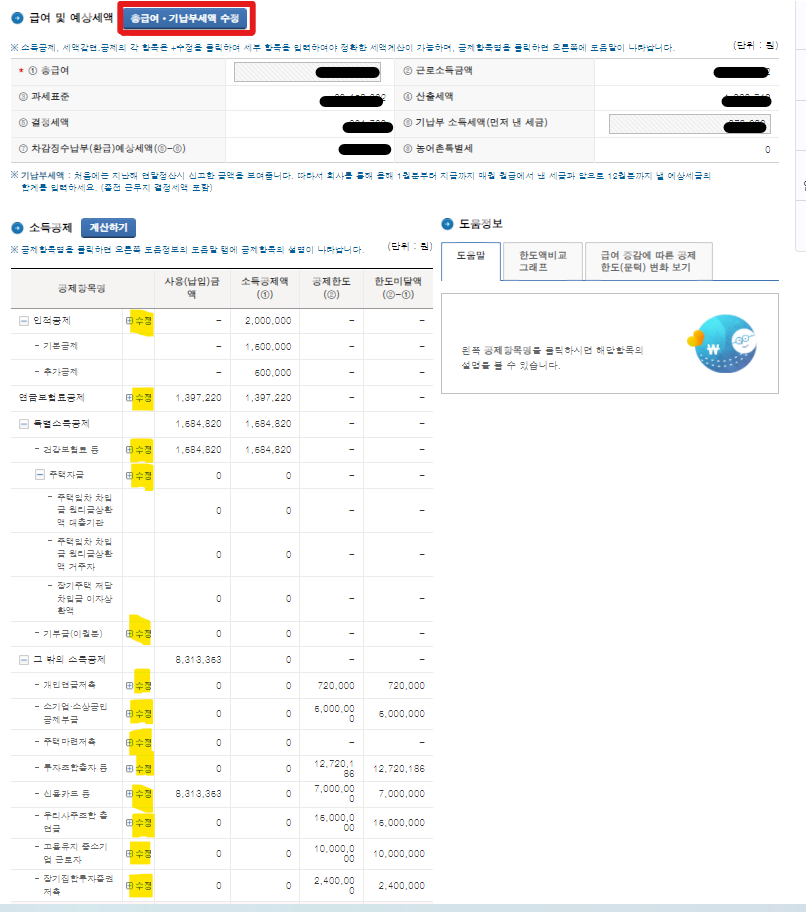 먼저 총급여와 기납부세액을 수정한 후 각 항목들을 수정탭을 눌러 수정한 후 적용을 눌러줍니다. 작년 지급명세서를 불러왔기 때문에 인적공제는 변동이 있는 경우만 수정합니다. 변동사항이 있다면 인적공제에서 추가로 등록해 주시면됩니다.