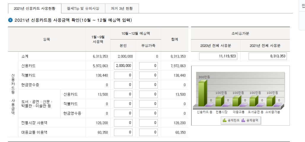 - 신용카드 사용액이 지난해(2020년)보다 5% 초과한다면 초과한 금액의 10%를 추가 공제 받을 수 있습니다.