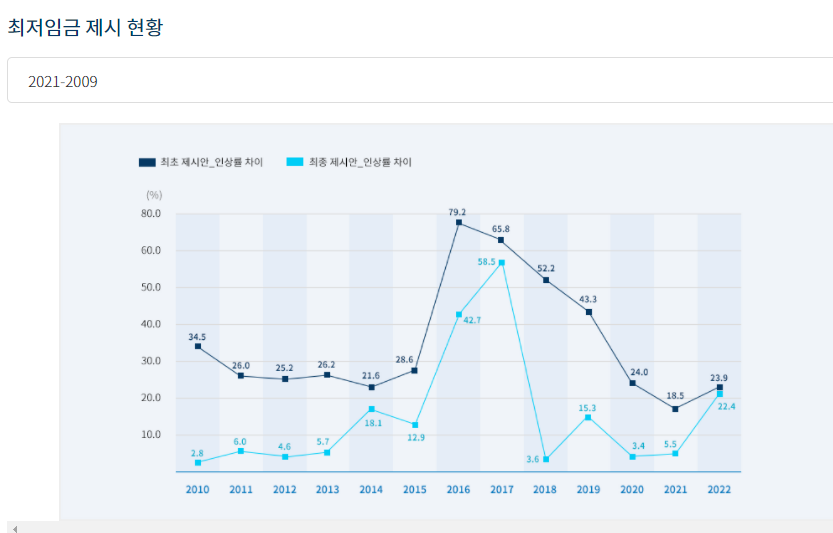 아래 표를 보시면 최저임금 결정 및 제시 현황을 확인할 수 있으니 확인해 보시기 바랍니다.