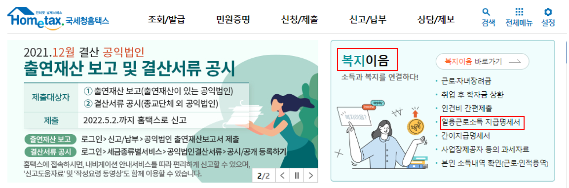 국세청 홈텍스(https://www.hometax.go.kr/)>[복지 이음]>[일용근로소득 지급명세서]>[정기 제출] 클릭
