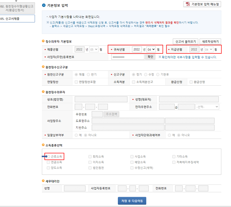 원천징수 의무자를 빠르게 한번 확인한 후 근로소득에 체크한 후 저장 후 다음 이동 클릭하면 나오는 화면..