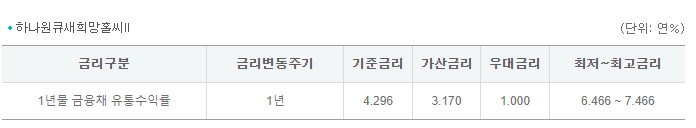위의 금리는 대출기간 1년, 당행 내부 신용등급 3등급 적용한 금리이며, 실제 적용금리는 신용등급 및 거래조건에 따라 가산 또는 감면되어 결정됨을 참고하시며 자세한 금리는 영업점이나 하나은행 콜센터(1599-2222)에 문의하시기 바랍니다.