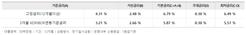적용금리는 시장 및 개인의 신용 조검, 대출조건 즉 상환방법, 자금용도, 대출기간, 취급 금액 등에 따라 변경될 수 있으니 자세한 금리는 상담을 통해 확인해 보시기 바랍니다.