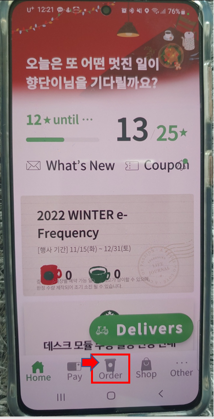 먼저 어플 메인 화면을 보면 2022년 겨울 프리퀀시가 시작하고 있는 것을 확인할 수 있으며, 아래쪽에 Order를 살짝 클릭합니다.