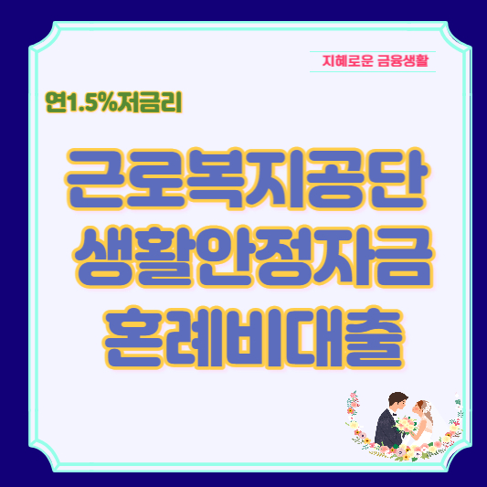 근로복지공단 생활안정자금 혼례비 대출은 1,250만 원 범위 내에서 저금리 연 1.5%의 이율, 기간은 혼인 신고일로부터 1년 이내로 사용이 가능합니다.