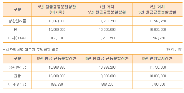 위 금액은 5년 원리금 균등분할상환 및 5년 만기 일시상환 방식별 비교 예시이며, 현재 이자율로 계산된 부담금액으로 분기별 이자율 변동 시 부담금액은 달라질 수 있음에 유의하시기 바랍니다.