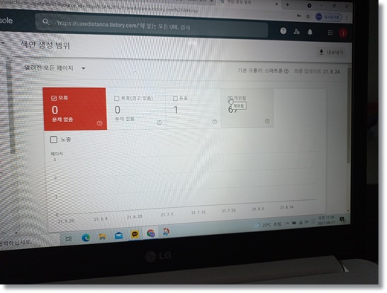 색인 요청은 하루에 다할 수 있는 것이 아니고 9-11개 사이 정도 안 되는 것 같다. 그래서 며칠에 나누어서 색인 요청을 하니 한 개밖에 보이지 않던 글이 65개나 보이는 것을 확인할 수 있었다.